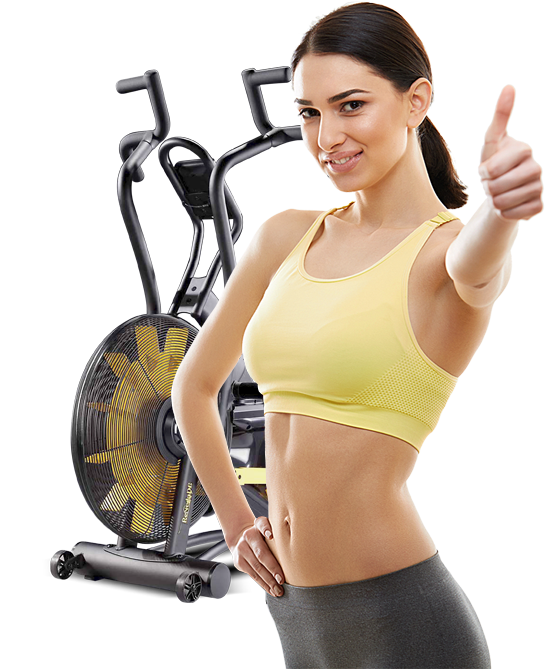 An Air Bike is an upright stationary exercise bike with handles, also known as a fan bike. The resistance is provided by a fan wheel that exponentially increases wind resistance as you pedal harder. The intensity of exercise on an Air Bike is completely dependent on the person exercising. You can exercise your lower and upper body at the same time, or exercise your legs or arms independently, simply by resting your feet on the pegs in the center of the fan wheel.